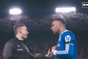 DAZN摄像机拍到姆巴佩上半场结束后与第四官员沟通。